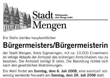 Gilt es normalerweise als Himmelfahrtskommando, gegen einen amtierenden Bürgermeister anzutreten, scheint dies in Mengen jedoch anders gelagert zu sein: Der Amtsinhaber hat vergleichsweise wenig Rückhalt in der Bevölkerung und im Gemeinderat, seit Wochen ist bekannt, dass die Mengener aktiv auf der Suche nach einem Herausforderer waren.